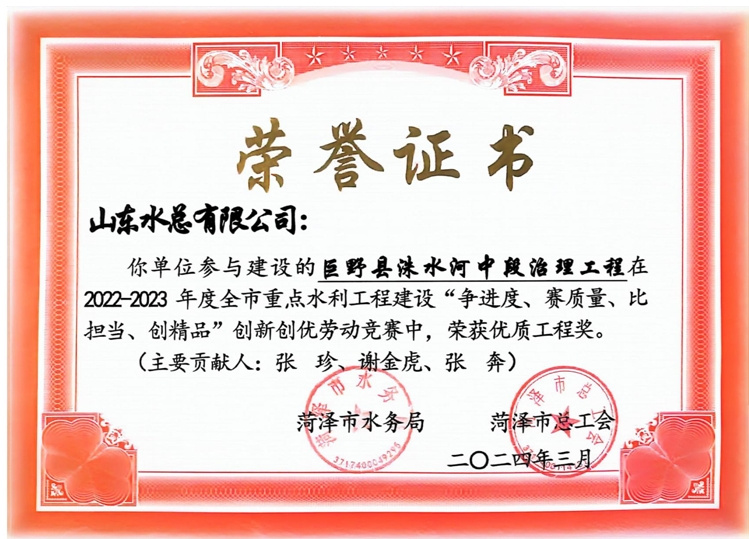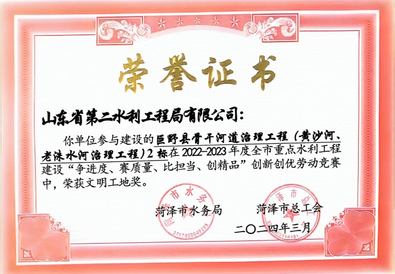 近日,菏泽市水务局、菏泽市总工会公布了“2022-2023年度全市重点水利工程建设“争进度、赛质量、比担当、创精品”创新创优劳动竞赛”获奖名单,完美体育唯一官网_完美体育(中国)体育官方网及权属单位二局有限完美体育唯一官网_完美体育(中国)体育官方网共荣获优质工程1项、文明工地2项、QC成果1项,优秀项目经理1项。