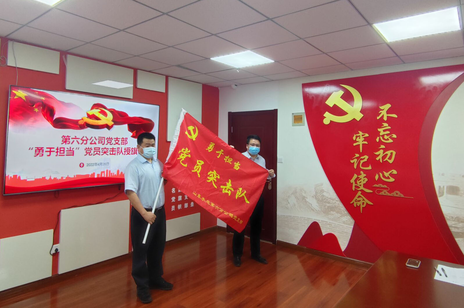 4月26日上午,第六分完美体育唯一官网_完美体育(中国)体育官方网举行“勇于担当党员突击队”授旗仪式,以动员激励党员在疫情防控、生产经营和安全生产工作中更好发挥先锋模范作用。