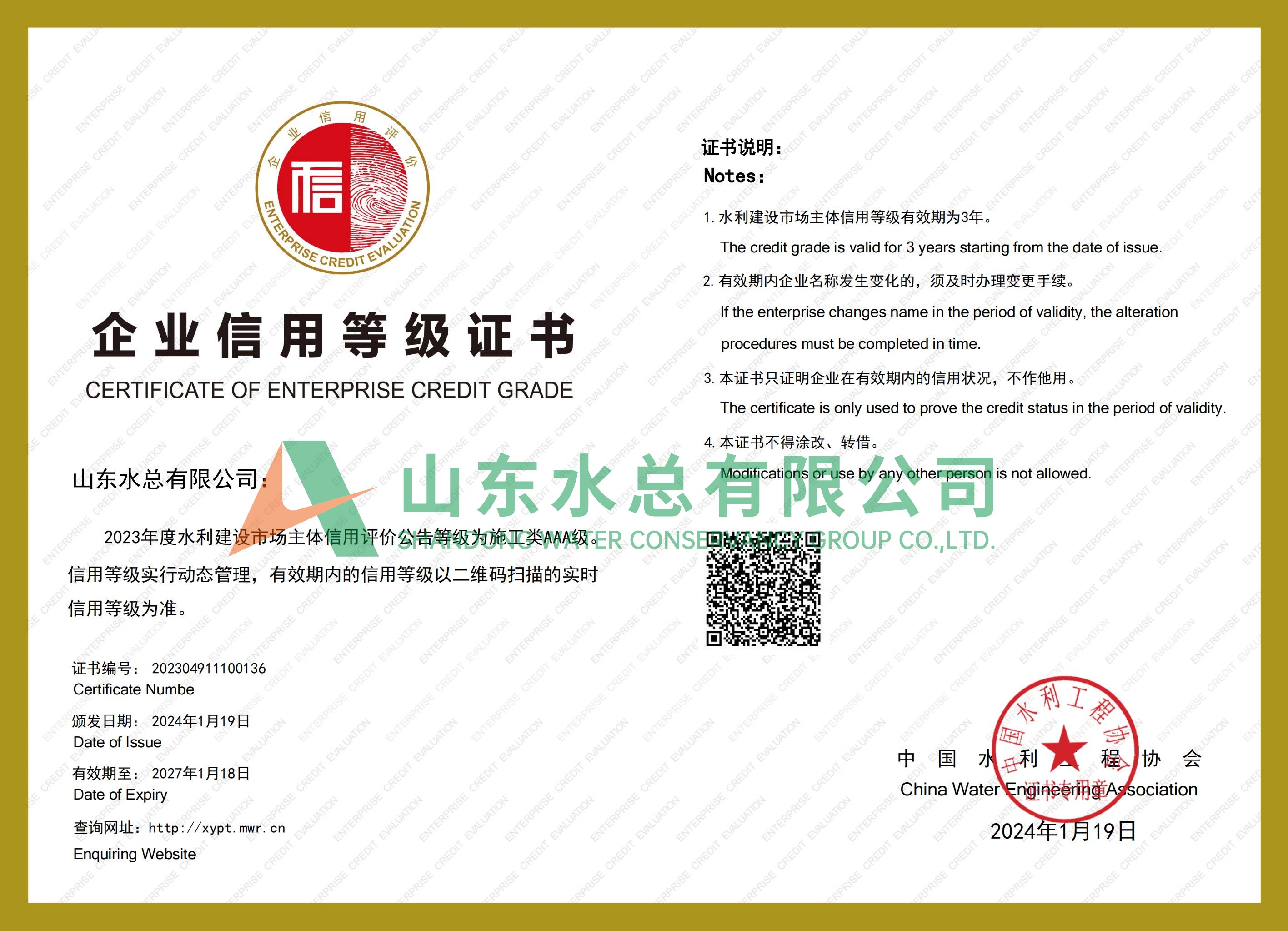 AAA信用等级证书